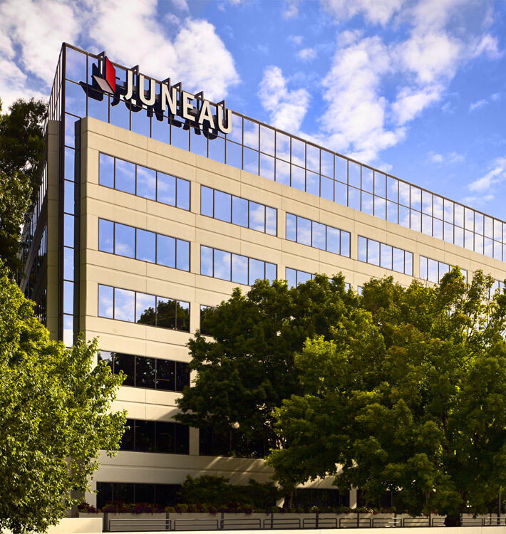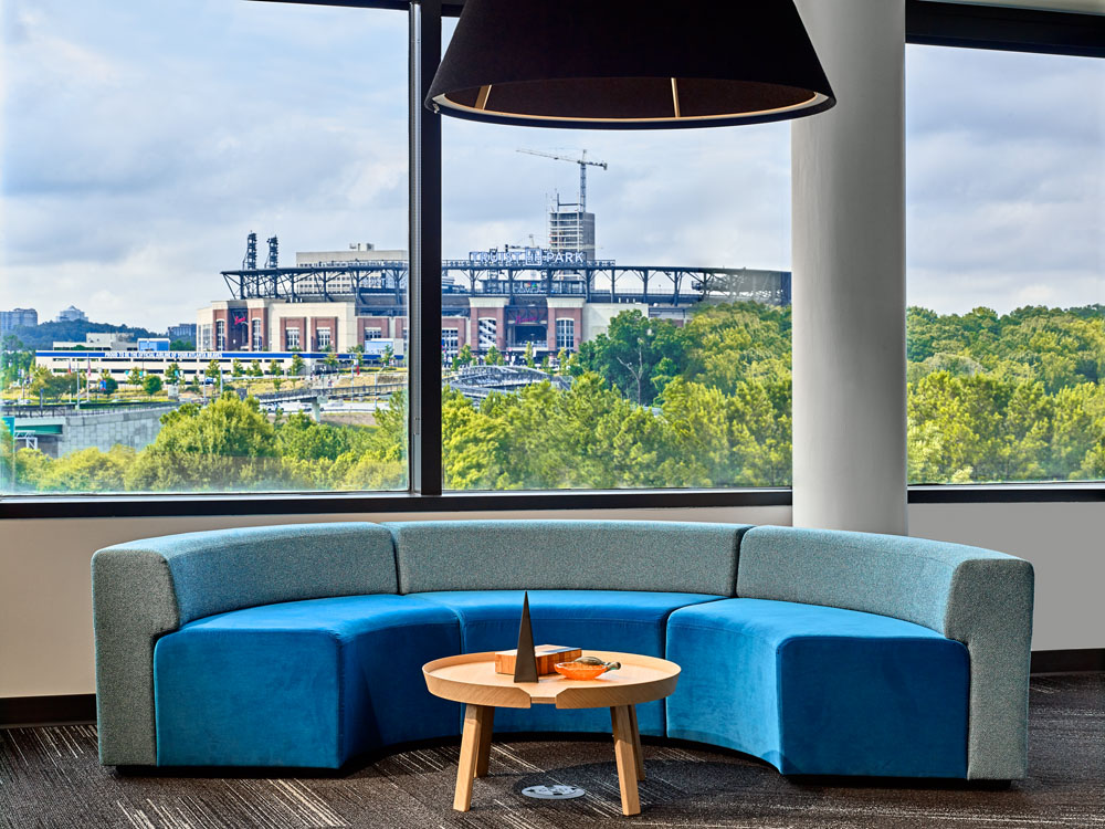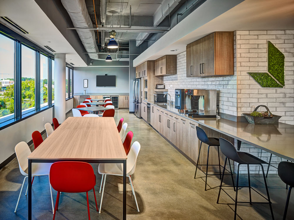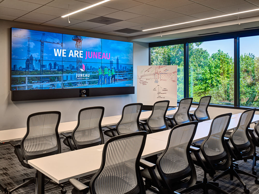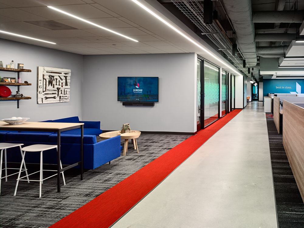 Juneau’s Corporate HQ was in need of an expansion due employee growth and additional collaboration spaces. This new state-of-the-art open office concept includes a 60+ seat training room with operable partition for additional seating in the cafe, with both booth and high-boy seating options. Additionally, there are 2 large conference rooms, 4 team rooms and 13 huddle rooms, several collaboration spaces, a wellness center, and outdoor balcony with seating that overlooks Truist Park. There are two separate technology labs, one with a high-tech video wall for team collaboration and the other a Virtual Design & Construction lab. This high-end office buildout includes new HVAC and electrical branch distribution. Finishes include built-in laminate workstations and low walls with cherry wood caps. Main lobby includes multi-level GWB drop ceilings, custom cherry reception desk and architectural accent lighting. The project also included renovations to corridors and restrooms.